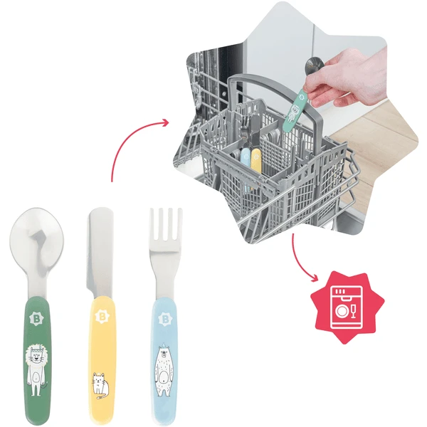 Het bestaat uit 1 vork, 1 mes en 1 lepel gemaakt van roestvrij staal, heeft afgeronde hoeken voor optimale veiligheid en scoort met schattige motieven. De dappere leeuw, de slimme kat en de sterke beer zullen je kleine beginneling helpen bij zijn eerste eetpogingen.