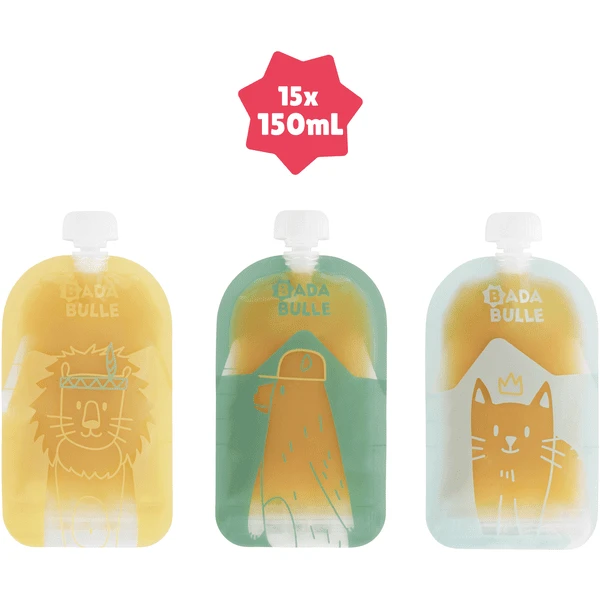 - 15 pakjes van maximaal 20 x 150ml herbruikbare knijpzakjes.