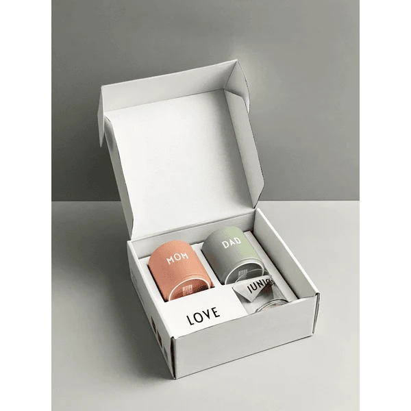 Familie geschenkdoos voor ouders en aanstaande ouders. Inclusief de mooiste mokken voor papa en mama van ultra-mat geglazuurd porselein en een druppelvrij drinkglas van Tritan voor de kleintjes.