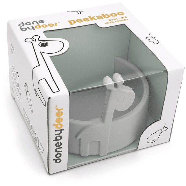 Kiekeboe, het is tijd om te eten! Raffi komt tevoorschijn uit de schattige en praktische siliconen kom, klaar om van het eten een extra leuk moment van de dag te maken. Met zijn grote hoogte en afgeronde binnenranden is het kommetje ideaal om gemakkelijk in te scheppen wanneer het kind zelfstandig leert eten. De schattige kom is gemaakt van siliconen van levensmiddelenkwaliteit, waardoor het splintervrij is en geschikt voor de magnetron, oven, vriezer en vaatwasser, en het heeft bovendien antislip-eigenschappen. De duurzame siliconen kom is perfect voor het opwarmen van babymaaltijden. De kleintjes zullen de schattige giraf graag bij zich hebben als ze eten – en pas op, een lange nek is perfect om een hapje te stelen. De praktische kom heeft een zachtgrijze kleur die past bij de Peekaboo serviescollectie en wordt geleverd in een schattig versierde geschenkdoos.