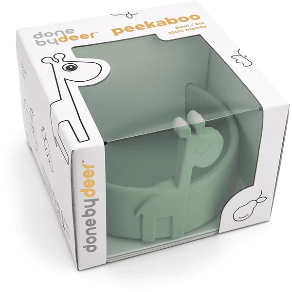 Kiekeboe, het is tijd om te eten! Raffi komt tevoorschijn uit de schattige en praktische siliconen kom, klaar om van het eten een extra leuk moment van de dag te maken. Met zijn grote hoogte en afgeronde binnenranden is het kommetje ideaal om gemakkelijk in te scheppen wanneer het kind zelfstandig leert eten. De schattige kom is gemaakt van siliconen van levensmiddelenkwaliteit, waardoor het splintervrij is en geschikt voor de magnetron, oven, vriezer en vaatwasser, en het heeft bovendien antislip-eigenschappen. De duurzame siliconen kom is perfect voor het opwarmen van babymaaltijden. De kleintjes zullen de schattige giraf graag bij zich hebben als ze eten – en pas op, een lange nek is perfect om een hapje te stelen. De praktische kom is afgewerkt in een zachte kleur groen, passend bij de Peekaboo serviescollectie, en wordt geleverd in een schattig versierde geschenkverpakking.