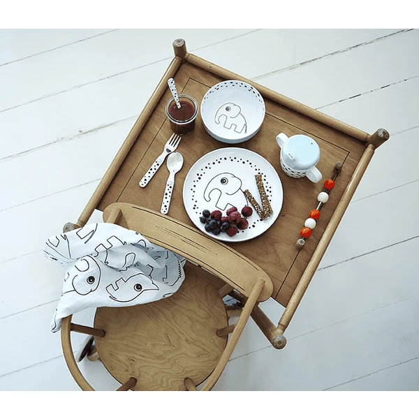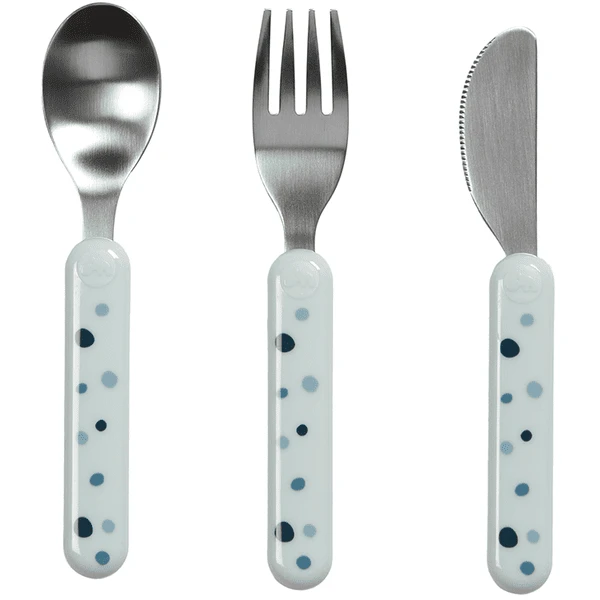 Voor dit kinderbestek zijn bijpassende borden, kommen, bekers en eetmatten beschikbaar.