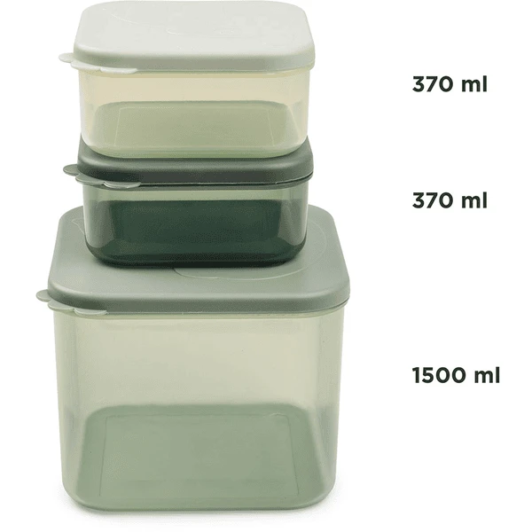- In de kleine voorraadpot past ongeveer 370 ml en in de grote 1500 ml.