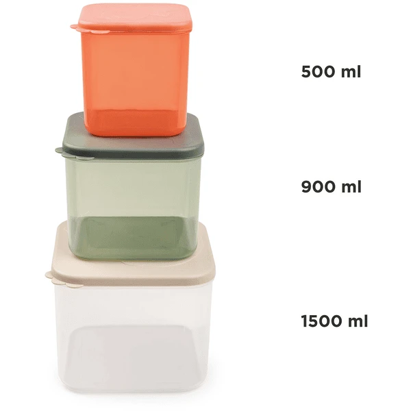 - In de kleine voorraadpot past ca. 500 ml, in de middelgrote 900 ml en in de grote 1500 ml.