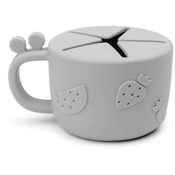 De grijze beker is erg praktisch voor kleine snacks voor onderweg. Uw kind kan het handvat met één hand vasthouden terwijl de andere reikt naar snacks. Praktisch in de kinderwagen, in de auto en voor uitstapjes.