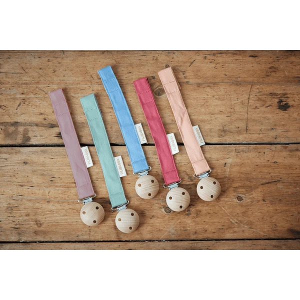 De fopspeenketting is gemaakt met een nikkelvrije Metal lclip op een houten knoop die aan de kleding van de baby wordt bevestigd, zodat de fopspeen altijd in de buurt is en niet op de grond valt. Aan het andere uiteinde kan de dummy gemakkelijk worden bevestigd aan de klittenbandsluiting van de dummyketting.