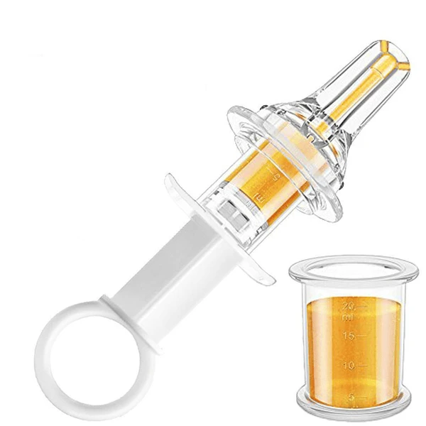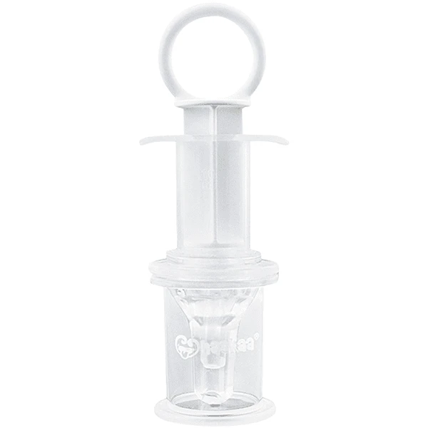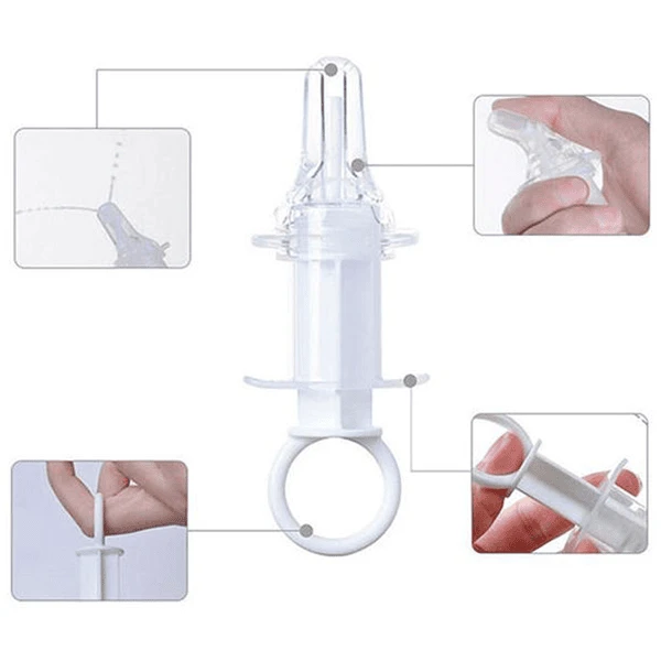 - Zijdelingse openingen op de speenpunt verspreiden het medicijn naar de zijkant van de mond in plaats van recht in de keel