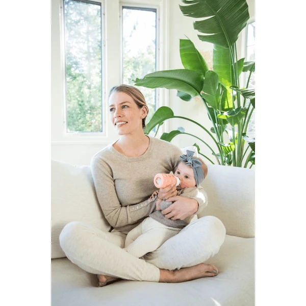 - Een afneembaar hoes van siliconen beschermt het glas tegen breken en zorgt er tegelijkertijd voor dat de baby de fles goed kan vasthouden.
