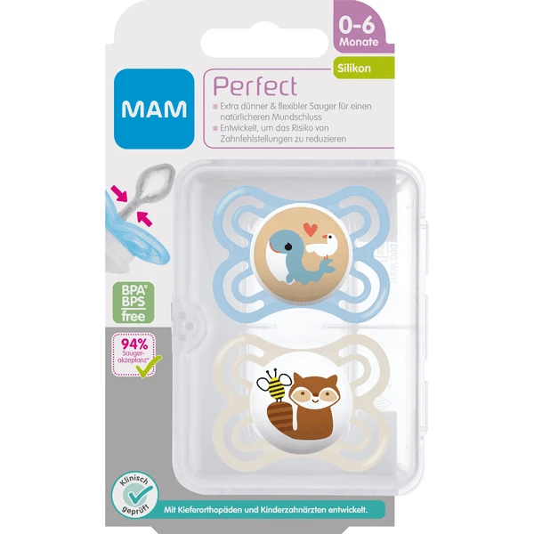 - De MAM Perfect Silicone fopspeen set van 2 is ontwikkeld in samenwerking met orthodontisten en tandartsen en voorkomt scheve tanden.