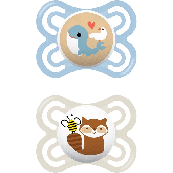 - 2x MAM Fopspeen Perfect Silicone, 0-6 maanden, walvis/wasbeer