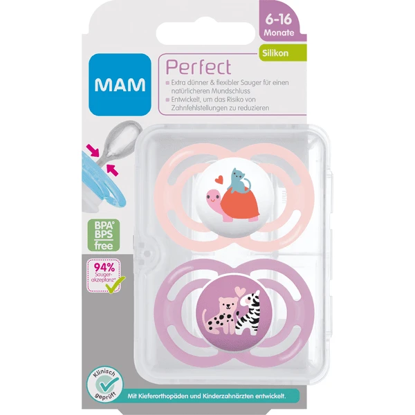 - De MAM Perfect Silicone fopspeen set van 2 is ontwikkeld met orthodontisten en tandartsen en voorkomt scheve tanden