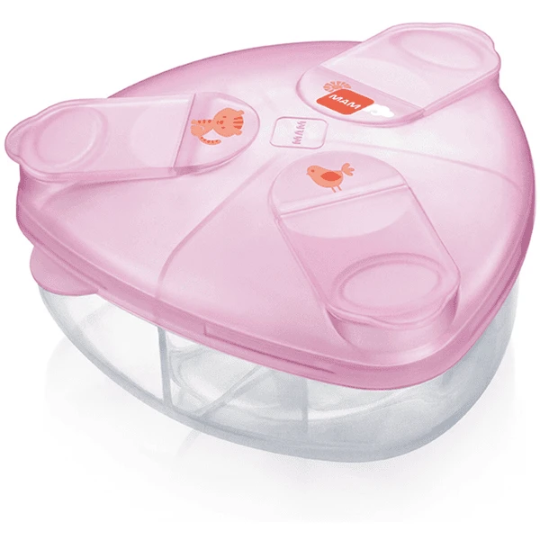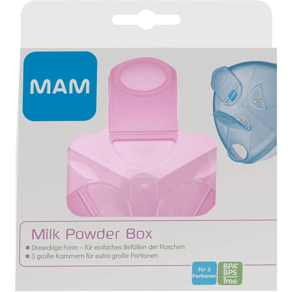 Het dagelijks leven met uw baby kan hectisch zijn. Vooral als je kleintje honger heeft, moet het snel gaan en heb je niet altijd beide handen vrij. Met de MAM melkpoederdispenser kan de juiste hoeveelheid melkpoeder eenvoudig worden geportioneerd en is altijd bij de hand. Indien nodig kunt u een zuigfles gemakkelijk met één hand vullen. Dankzij de innovatieve driehoekige vorm blijft er geen poederresidu achter in de container. De box heeft 3 compartimenten en biedt dus ruimte voor 3 porties babyvoeding met elk maximaal 40 g. Bovendien is de container bijzonder plat en licht en vindt daardoor ruimte in elke luiertas – ideaal voor onderweg. De kliksluitingen zijn eenvoudig te openen en te sluiten en houden toch een goede afsluiting. Voor een eenvoudige bediening is de melkpoederdoos steriliseerbaar en vaatwasmachinebestendig. Als de melkpoederautomaat niet nodig is voor babyvoeding, kan deze ook worden gebruikt voor het bewaren van snacks, fopspenen of flessenspeentjes.