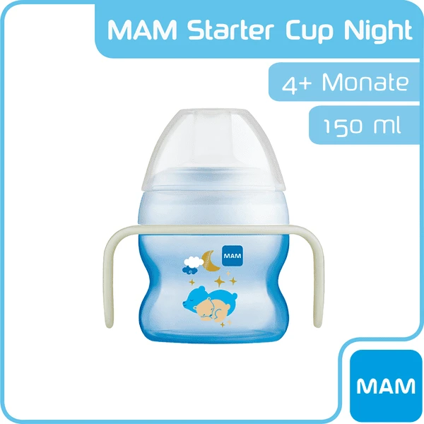 De getailleerde vorm en de ergonomische, antisliphandvatten maken het voor baby’s en peuters gemakkelijker om de beker vast te houden. Bovendien gloeien de handvatten in het donker, zodat baby’s en ouders de fles gemakkelijk kunnen terugvinden – voor rustigere nachten. Dankzij het afsluitdeksel kan de drinkbeker worden afgesloten en dus gemakkelijk worden meegenomen voor onderweg. De MAM Starter Cup kan in de vaatwasser gereinigd worden en is geschikt voor kinderen vanaf 4 maanden. Alle afzonderlijke onderdelen van de MAM Starter Cup kunnen worden gecombineerd met andere MAM drinkbekers.