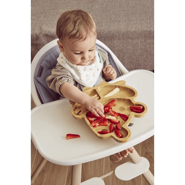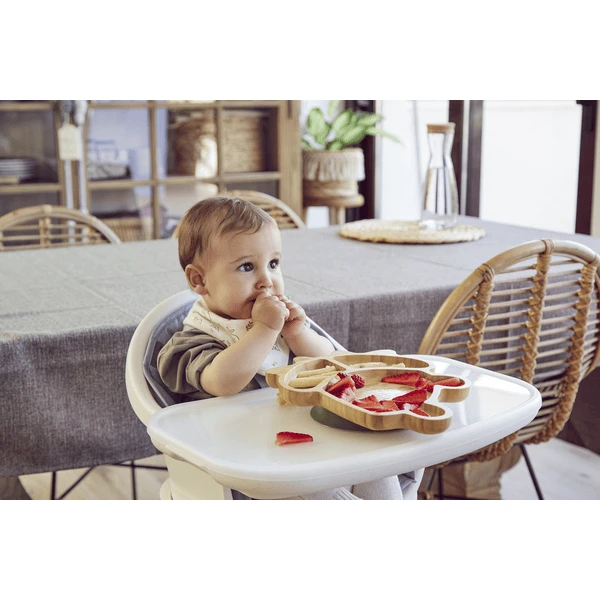 - Het bord is gemaakt van bamboehout, een natuurlijk en duurzaam materiaal, zodat de kleintjes leren eten en de natuur respecteren