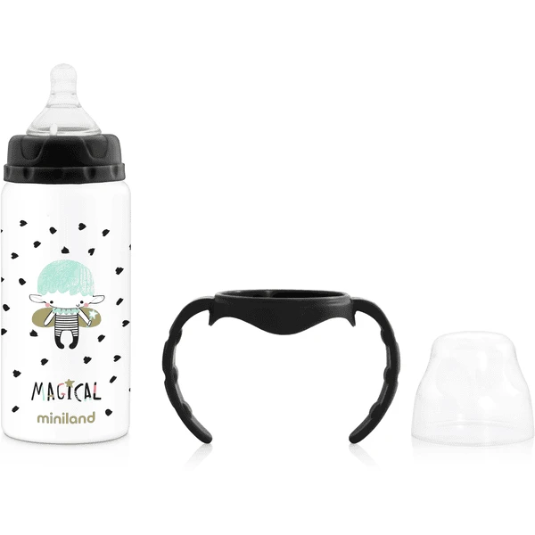 De Miniland -Thermobaby flessen en de magische Thermokid thermosflessen houden, dankzij de dubbele stalen wand, de temperatuur van de vloeistof nog langer warm, zodat je kleintje overal van de warme drank kan genieten.