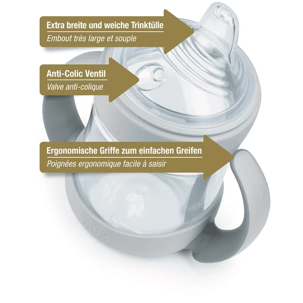 De fles NUK Nature Sense is bijzonder geschikt voor baby’s die tot nu toe borstvoeding hebben gekregen en nu langzaam moeten wennen aan zelfstandig drinken, zonder het vertrouwde gevoel van drinken uit mama’s borst te moeten opgeven. De extra brede en zachte siliconentuit (20% breder dan conventionele tuiten) van de fles geeft uw baby een natuurlijk gevoel van drinken zodra de fles is bevestigd. Bovendien zorgt het innovatieve antikoliekventiel voor drinken zoals aan de borst zonder te kolven en voorkomt zo dat de baby lucht inslikt. De lekvrije drinkopeningen zorgen voor veilig vervoer zonder morsen, zodat de drinkbeker ook onderweg een trouwe metgezel blijkt te zijn. De zachte, ergonomische handgrepen, waardoor uw kleintje de fles gemakkelijk kan vastpakken, en de antislipbodem, die zorgt voor een stevig houvast, zijn beide handig bij het leren drinken. De NUK Nature Sense fles in zachte kleuren is gemaakt van hoogwaardig, duurzaam polypropyleen en kan vrij worden gecombineerd met de artikelen uit het NUK Nature Sense assortiment.
