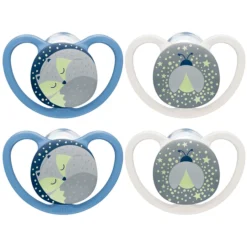 NUK Lichtgevende fopspenen helpen je baby gemakkelijk de weg te vinden naar dromenland. Dankzij een lichtgevend materiaal dat veilig is voor baby’s, geven ze een zachte gloed af in het donker en kunnen ze ’s nachts dus snel en gemakkelijk worden gevonden.
