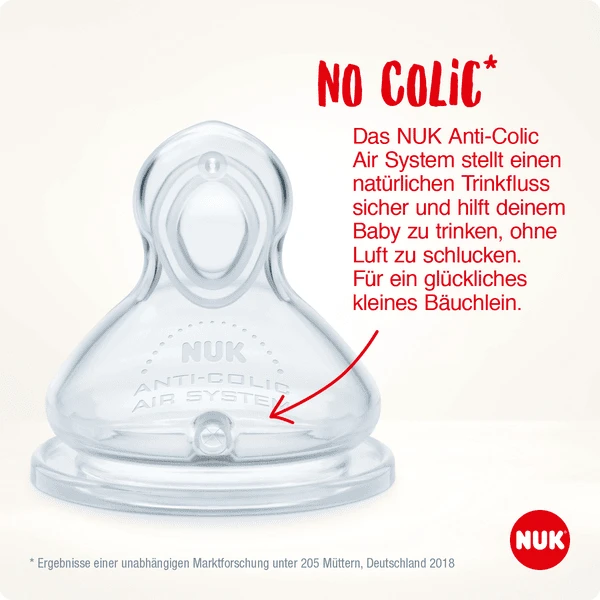 Elke NUK First Choice ⁺ babyfles in de starterset is uitgerust met een kaakvriendelijke NUK speen van latex met een natuurlijk brede lipondersteuning, die je baby een natuurlijk drinkgevoel geeft, net als aan de borst van je moeder. Het antikoliek luchtsysteem van de speen ( NUK ) vermindert het risico op koliek bij zuigelingen, omdat je baby minder lucht inslikt bij het drinken. Alle NUK First Choice ⁺ glazen flessen zijn geschikt voor een combinatie van borst- en flesvoeding en groeien met je baby mee – naarmate je baby groeit, kunnen de flessen gemakkelijk worden gecombineerd met andere NUK First Choice ⁺ spenen en drinkhulpstukken.
