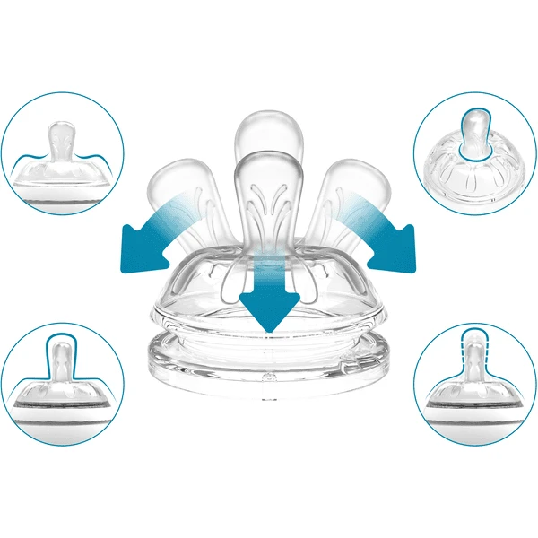 Mimic babyflessen kunnen worden gebruikt met spenen in 4 verschillende maten om de melkstroom te regelen van pasgeborene tot aanvullende voeding.