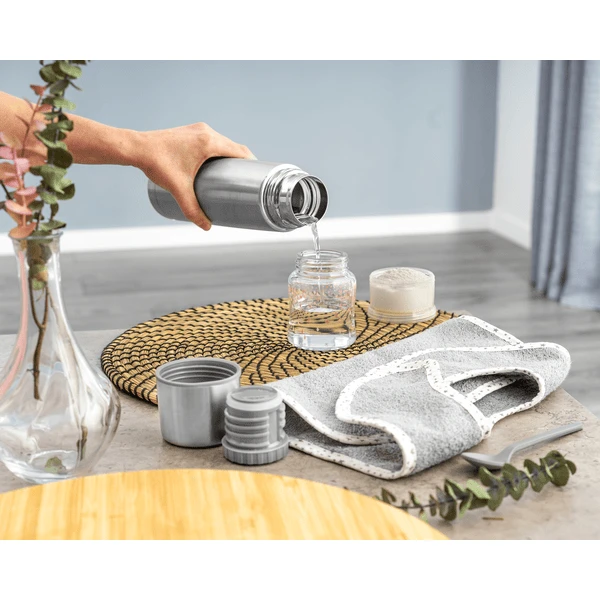 De Pure isoleerfles bestaat uit een vacuümgeïsoleerd, dubbelwandig flessenlichaam. Dit zorgt ervoor dat het gevulde warme water tot 12 uur lang warm wordt gehouden. Dankzij de dubbele isolatie wordt de fles nooit heet wanneer ze van buitenaf met heet water wordt gevuld en beschermt ze dus tegen brandwonden.