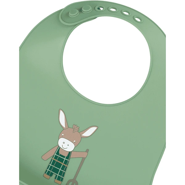Met dit flexibele siliconen slabbetje met groot motief ezel “Emmilius” kun je gemakkelijk iets missen tijdens het voeden. Het slabbetje is vaatwasmachinebestendig, BPA-vrij en heeft een praktische morsbak. Op die manier worden de kleren en de vloer beschermd tegen voedselresten. Dankzij de verstelbare sluiting kan het slabbetje lange tijd worden gebruikt.