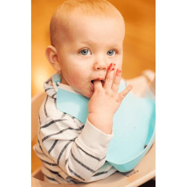 De diepe lekbak voorkomt dat voedselresten op de kleding van de gebruiker Babys terechtkomen. De parelsluiting is verstelbaar en groeit mee met de baby.